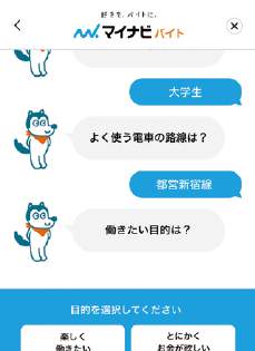 マイナビバイトのキャラクター「バスキー」が初めてサイトに訪問した求職者に対して、求職者の特性を細かくヒアリングするコンテンツです。ヒアリングで得られた回答は、都道府県トップページで求職者に最適な求人を提供するために利用されます。