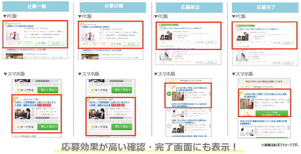 ユーザーが検索、閲覧する条件と同じ大職種×エリアが近い順に、4画面(仕事一覧、仕事詳細、応募確認、応募完了)において、おすすめ求人枠に表示されます。