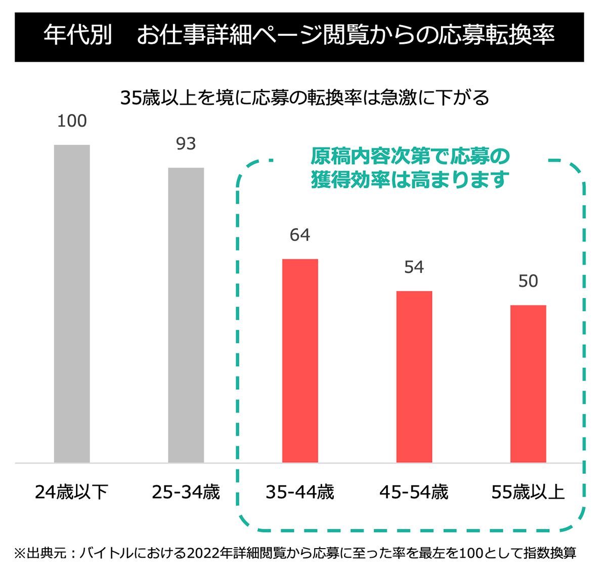 閲覧されているにもかかわらず、若年層とミドル層以上では応募転換率に大きな差があるのが実態。
