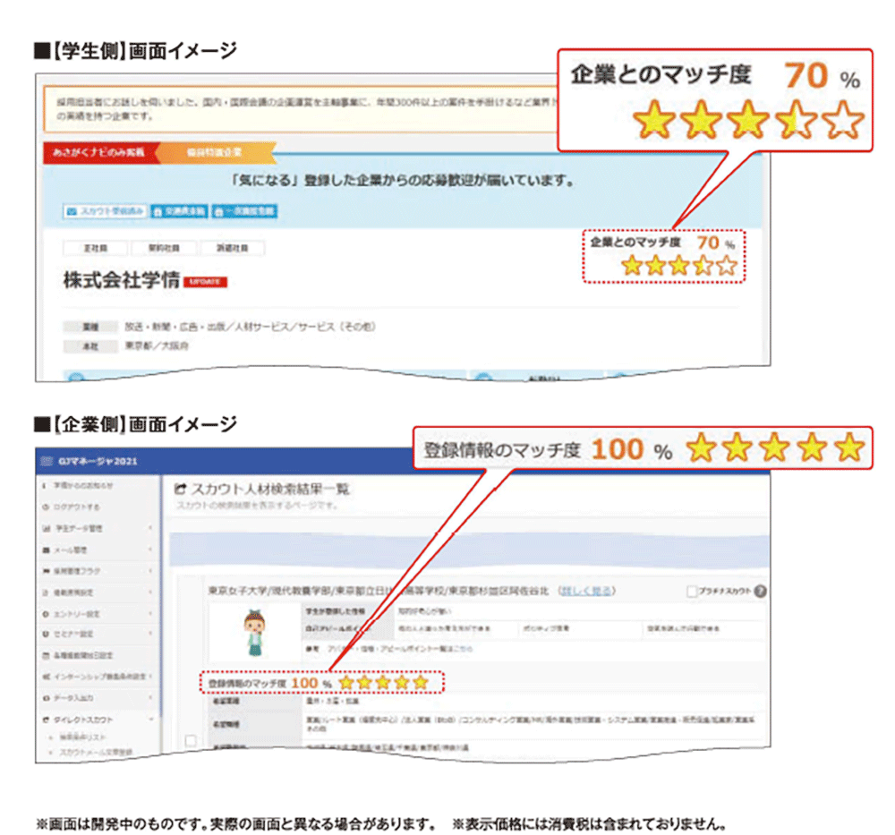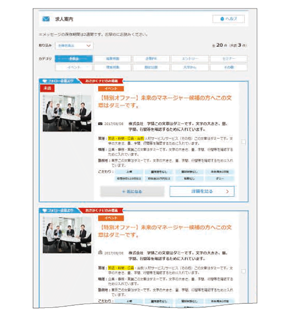 また、オプションとしてプラチナ求人案内も用意してあり、配信されたその日に学生のマイページ上で上位表示されます。特別感を演出することで、学生の発見率が大幅に向上します。
