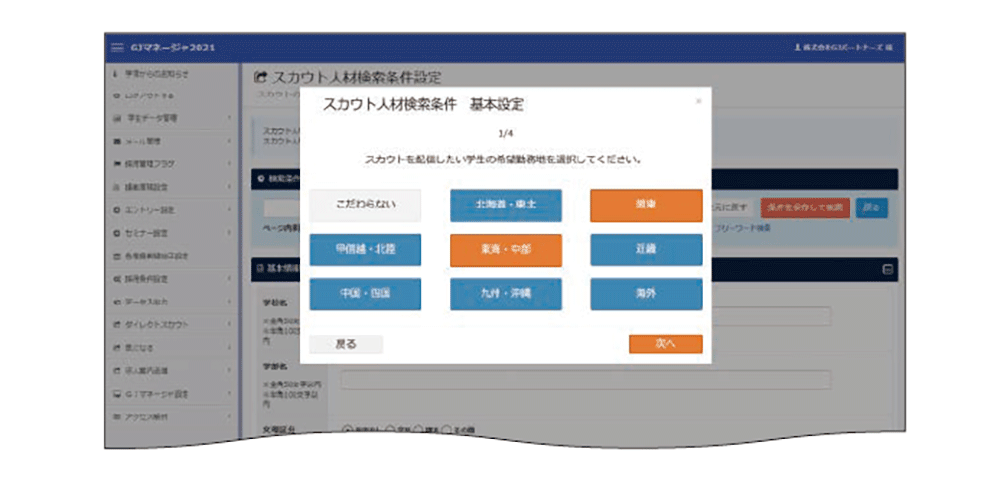 スカウト配信対象の抽出テーマごとに選択項目を表示し、ナビゲーションに従って順番に条件を設定することでスカウト対象の学生をすぐに抽出することができます。