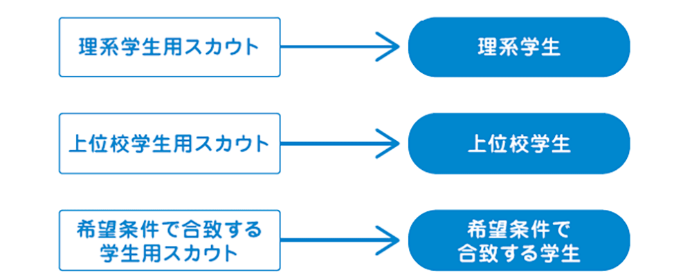 希望の業種・職種・勤務地などに合致する学生へ貴社求人を告知する機能です。