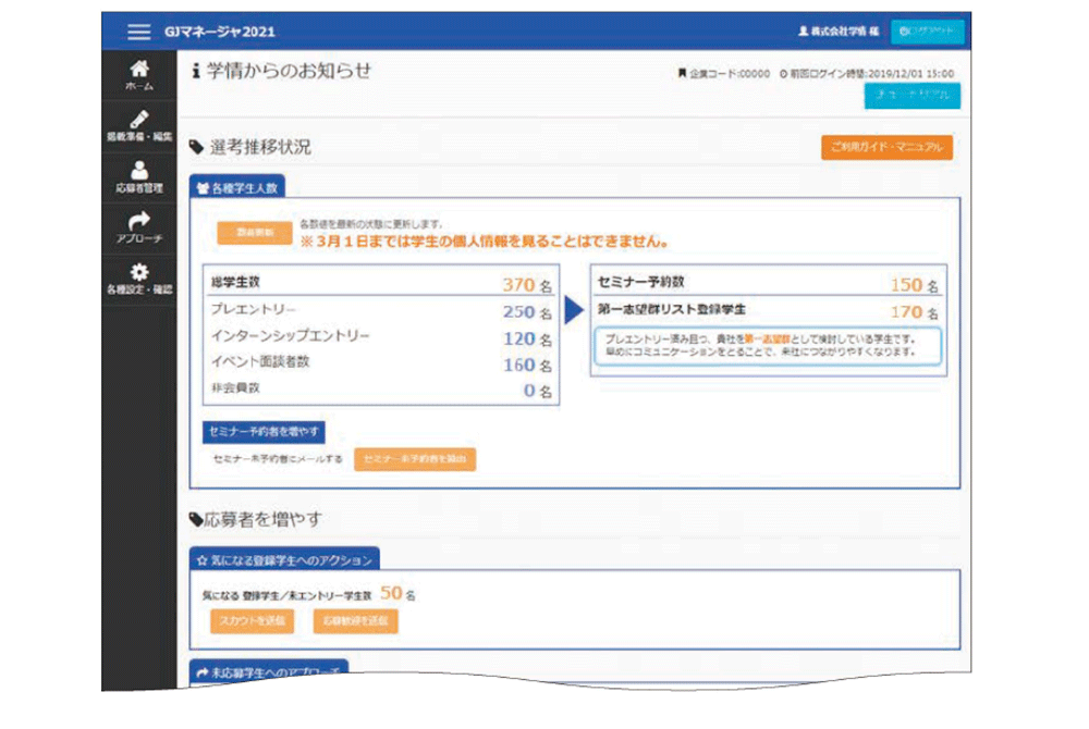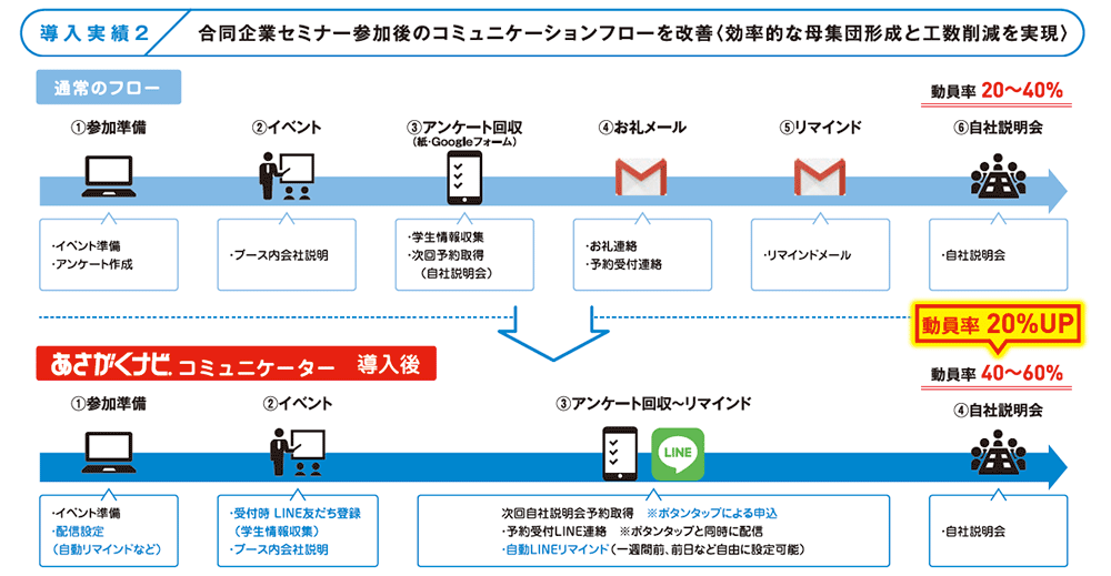 合同企業セミナーとのデータ連動でアクティブな学生と会うこともできます。面談した全ての学生のマイページ上に「プレエントリー企業リスト」として登録されます。また、就職博をはじめとした各種イベントに来場した学生の行動データを全てあさがくナビにデータ化。ダイレクトスカウトや求人案内、紙DMなどを送付する際に、アクティブユーザー(積極的にプレエントリー先を探している学生)にセグメントして、アプローチが可能です。