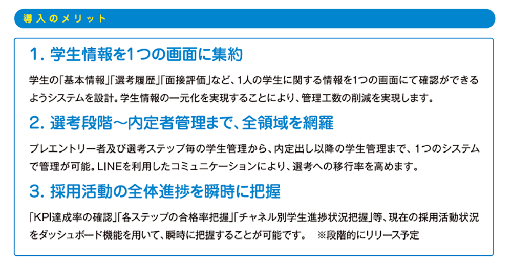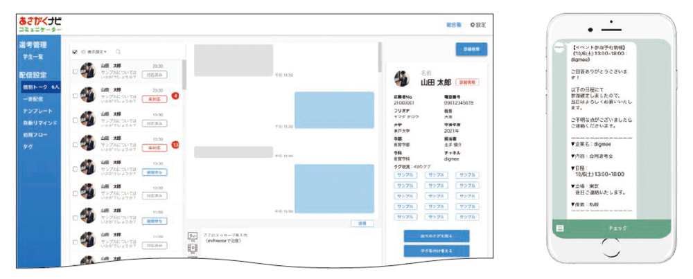 LINEを活用したコミュニケーションを行うことにより、学生とのこれまでにないスムーズなやりとりが実現できます。高い開封率と返信率を誇り、選考日程の調整や学生からの問い合わせ対応など、コミュニケーション工数の削減が可能となっています。