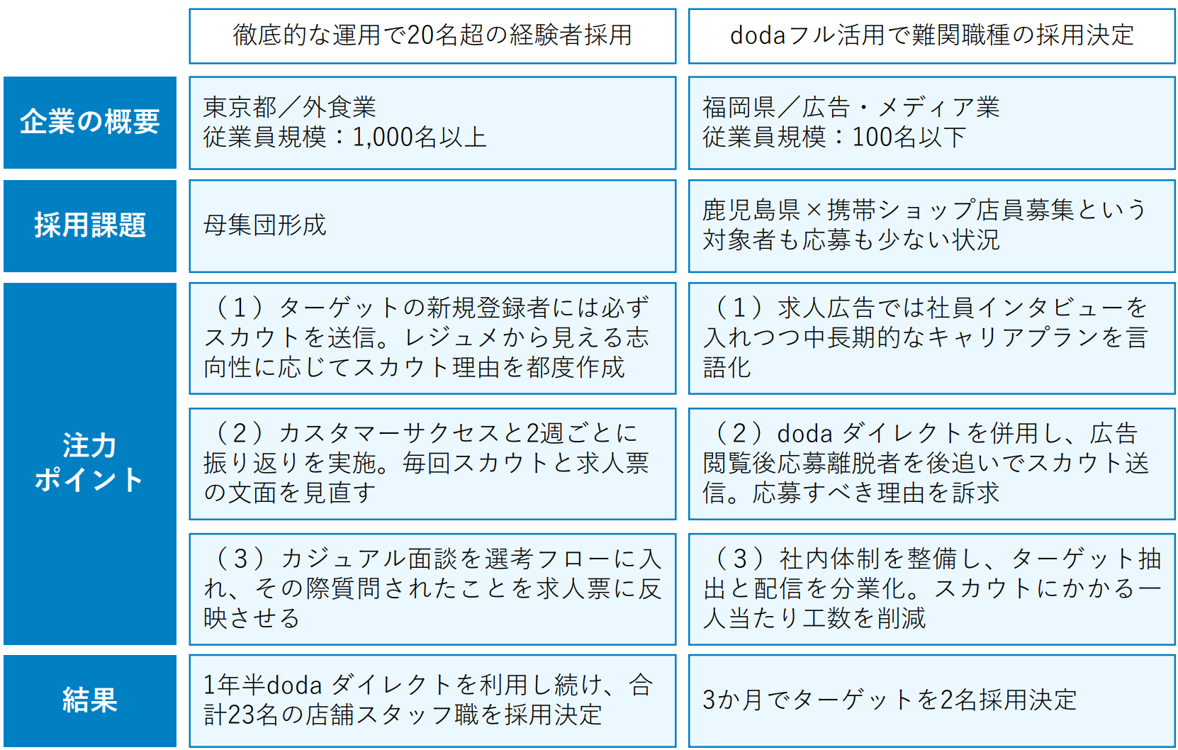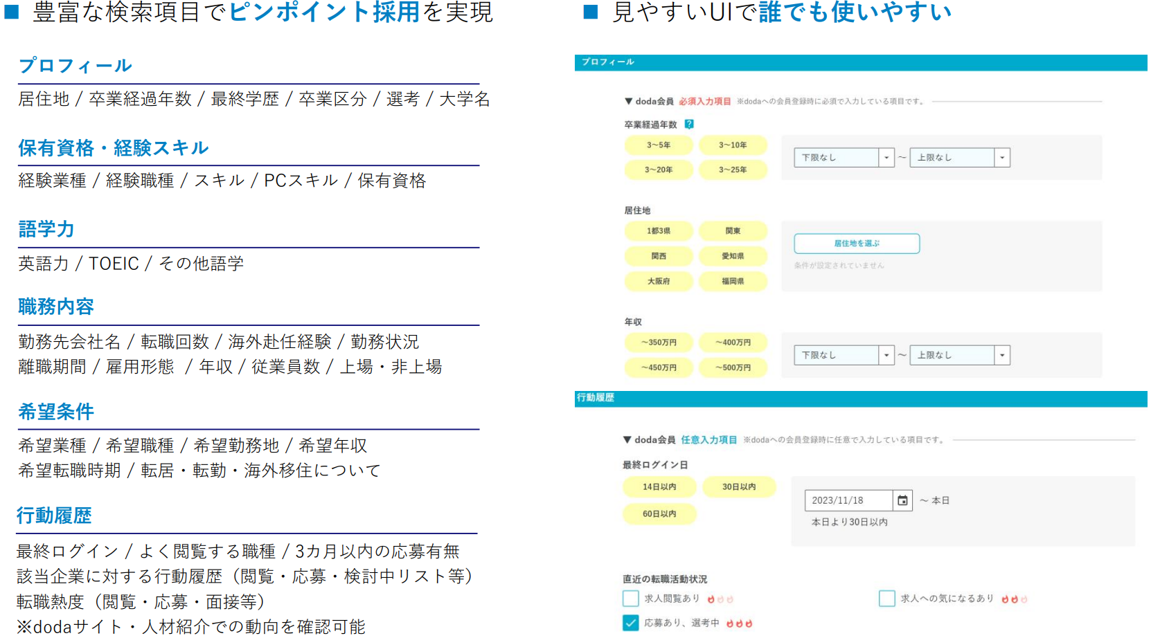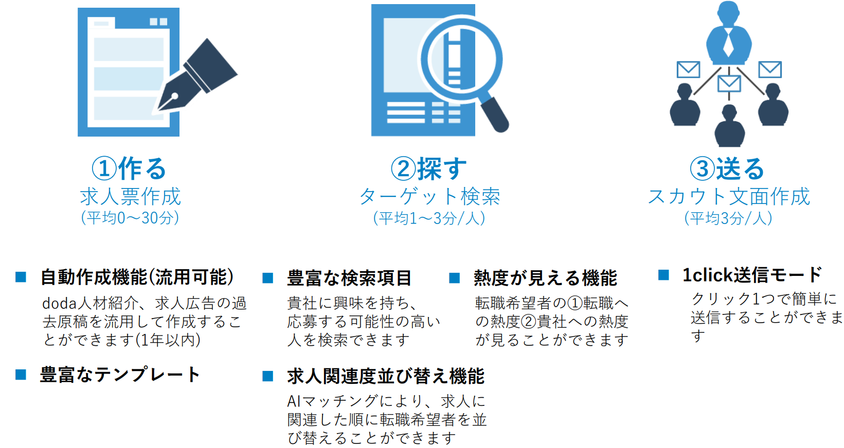 ※「doda ダイレクト」は、申込日以降であれば、利用開始日前から、求人票/スカウトメール作成・配信予約/採用候補者検索に着手いただけます。