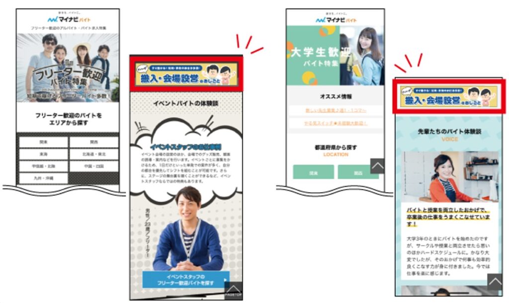 マイナビバイト内の『フリーター』『大学生』のお仕事をまとめたLPにバナーを設置!興味を持ちそうなユーザーにアピール&流入経路が増え、閲覧数・応募数UPにつながります!