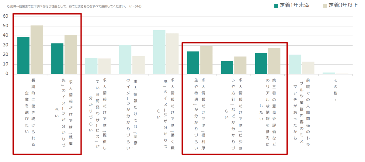 現職で3年以上勤務している人は、1年未満の人に比べ「就業先のイメージが沸くか」、「長期的に働き続けられそうか」に着目しています。