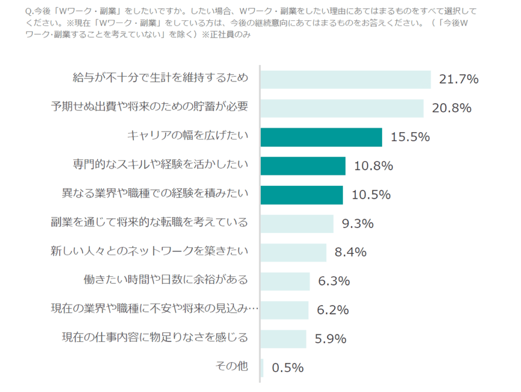 貯蓄などの金銭面だけではなく、キャリアの幅を広げる、経験を活かすために副業を希望。