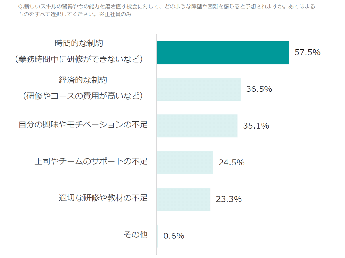 新しいスキルの習得の機会に対して「時間的な制約」に関する不安が大きい。