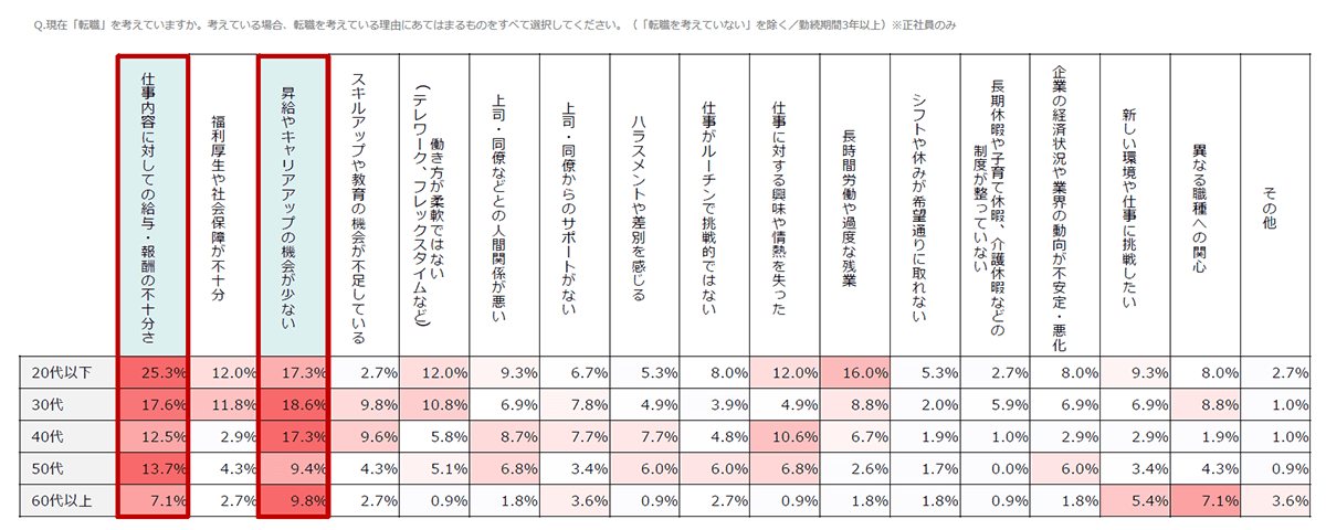 給与や報酬の不十分さが転職を考える1番の理由になる中、特に勤続3年以上は「昇給やキャリアアップの機会の少なさ」が次に多い理由になります。
