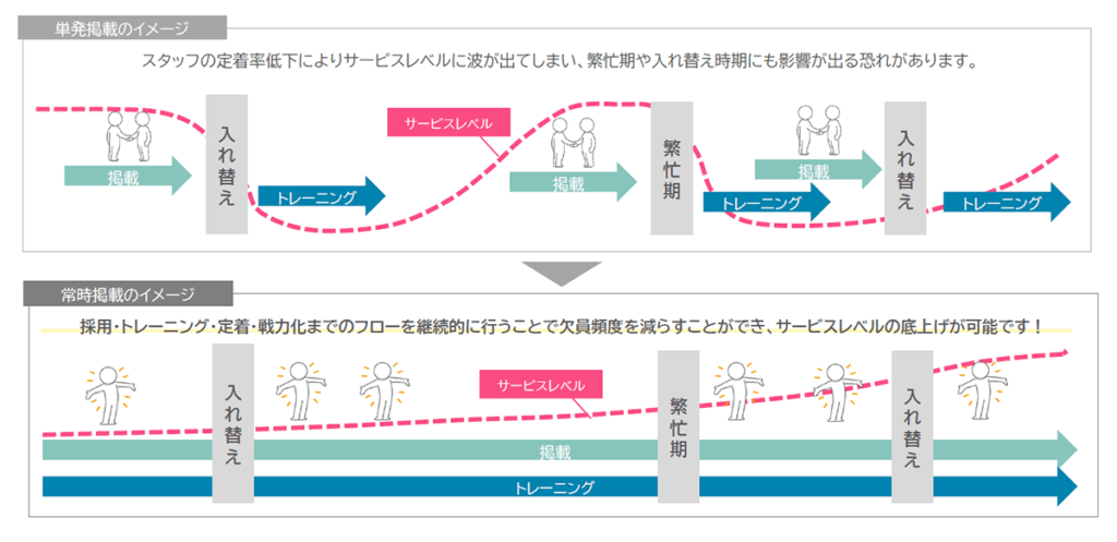 常時掲載により、スタッフの入れ替え時期や繁忙期までに、戦力となるスタッフを確保します!
