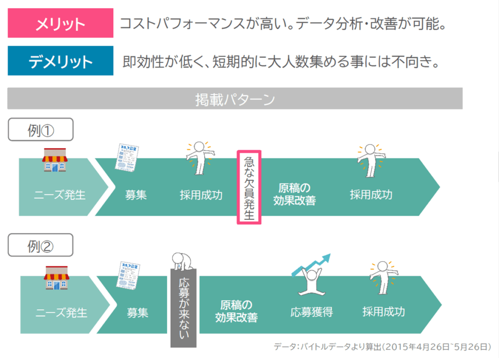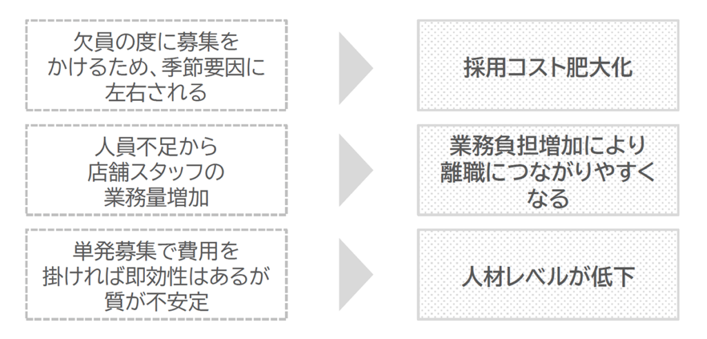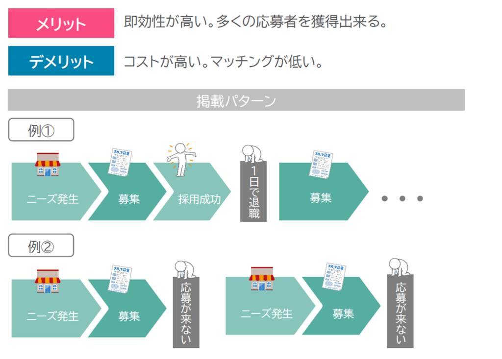 すぐに集めたい!というニーズに応える事が出来る反面、採用難の時代では、一回求人を出してもすぐ辞めてしまい、結果的に一カ月に複数回求人を出す事になってしまいます。