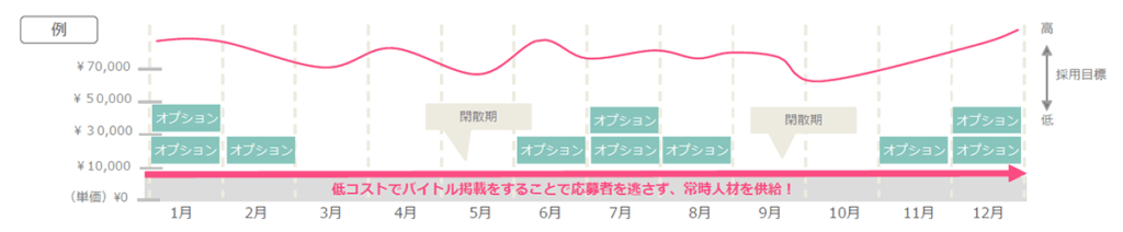 一度の募集で多くの応募を集める事が難しい為、常時掲載で一件当たりの 求人費を 削減し、データ 分析によって効果改善を常に行うことでコストを抑えながら採用成功へとつなげます。