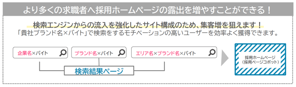 マッチングの高い応募者を獲得できる 「採用ページコボット」を利用し集客力 &応募数の強化が可能です。