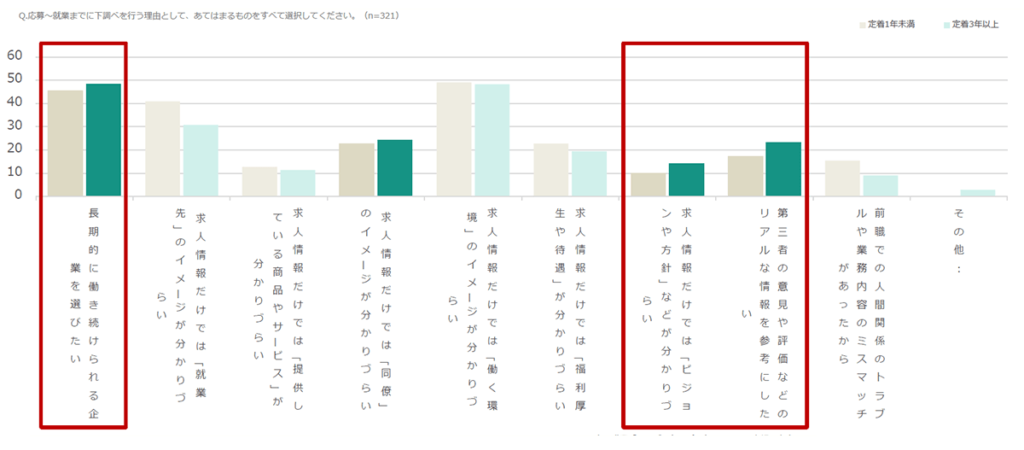 現職で3年以上勤務している人は、1年未満の人に比べ「長期的に働き続けられる企業を選びたい」「リアルな情報をもとに判断したい」傾向に。