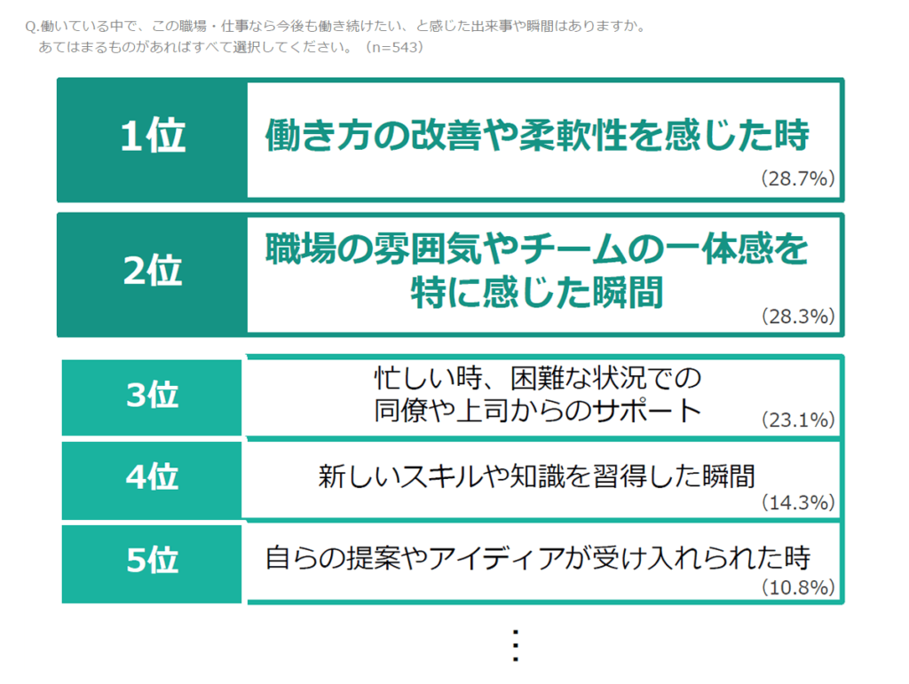 勤続期間に関わらず、働き方への理解や職場の雰囲気・上司からのサポートなどの職場環境が働き続けるきっかけに。