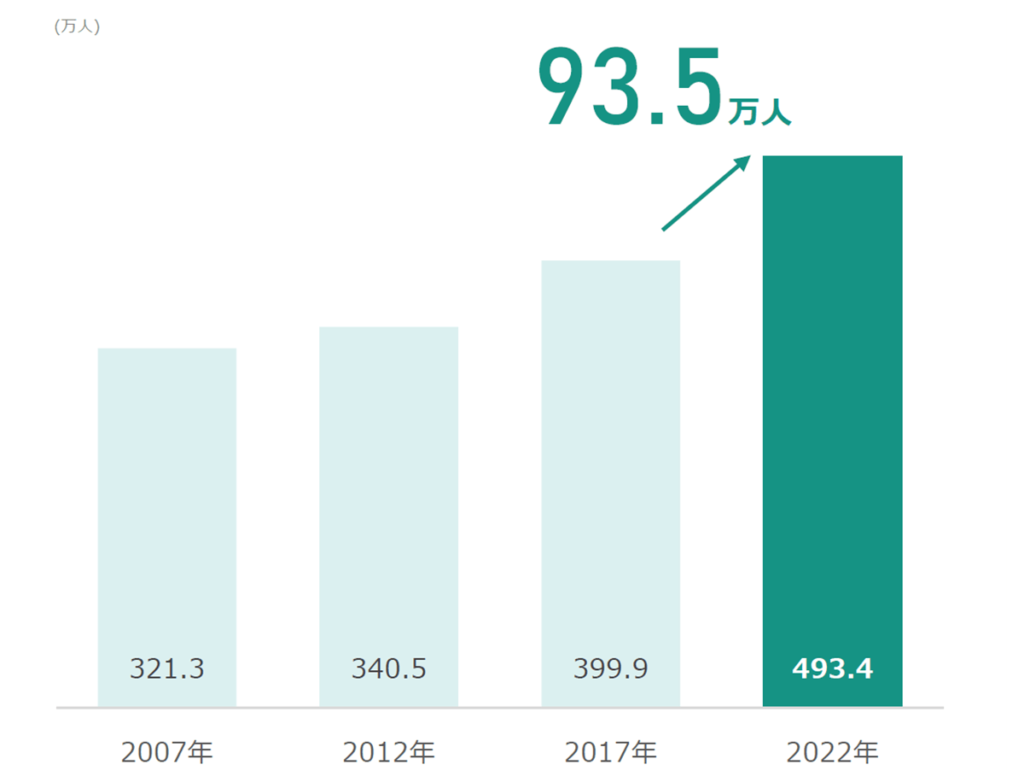 副業・W ワークの希望者は年々増えており、 5 年前と比べ 93 万人増加。