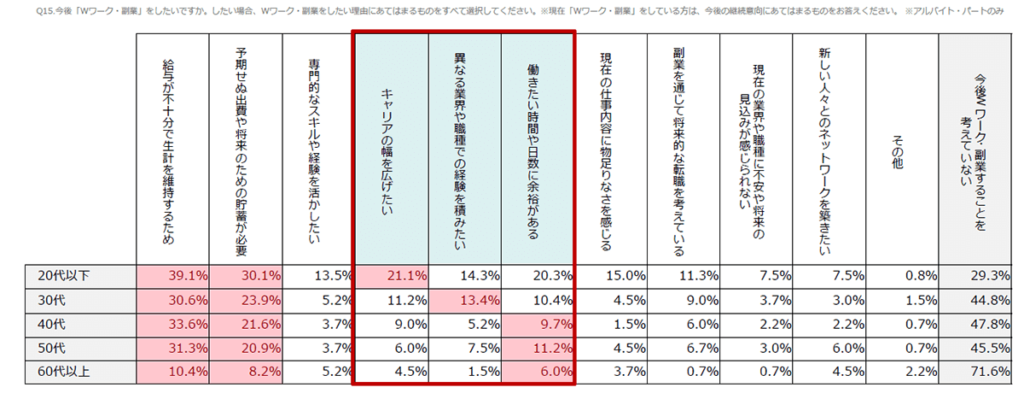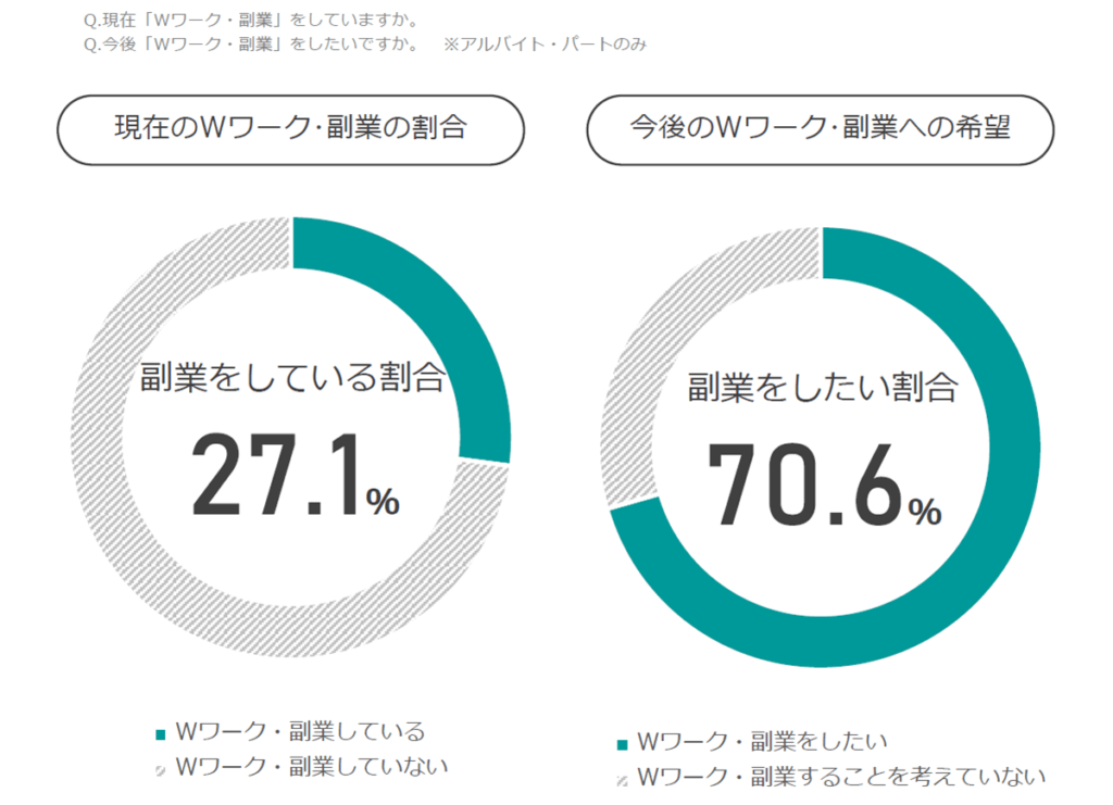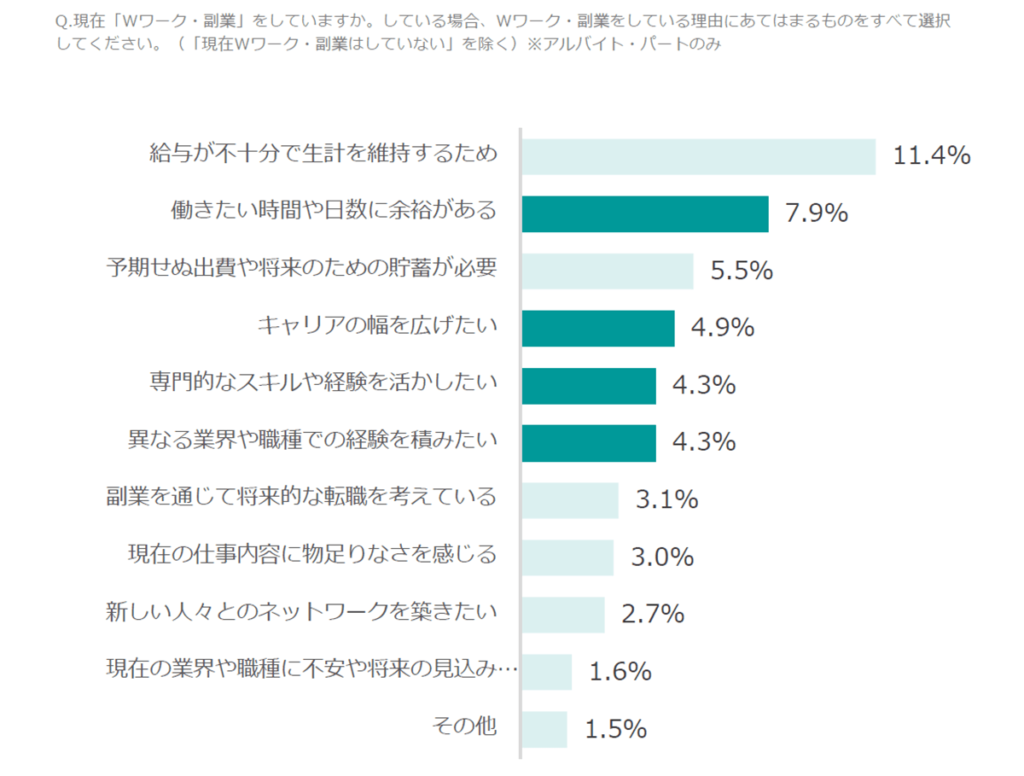 Wワーク ・副業をする理由に、貯蓄などの金銭面だけではなく、キャリアの幅を広げる、異なる業界や職種での経験を積むために行っていると回答。