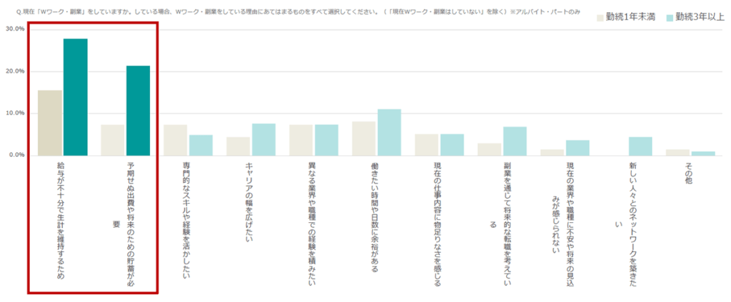 勤続期間別に傾向をみると、特に勤続3年以上は「給与が不十分」「貯蓄のため」の理由が多い。