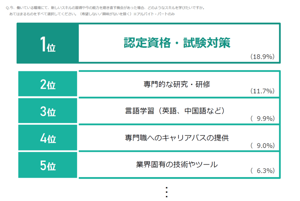 アルバイト・パートは勤続期間によっての希望するスキルに大きな変化はなく、特に 「 認定資格 ・試験対策」に対する希望度合いが高い。