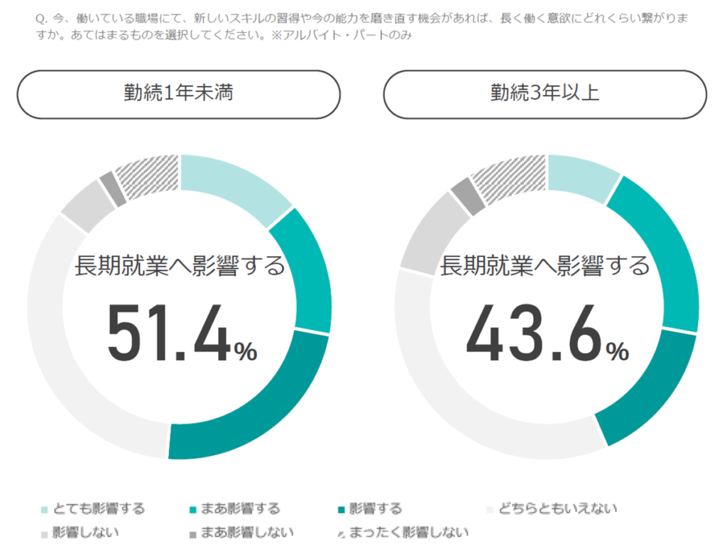 リスキリングへの取り組みが長く働く意欲に繋がる割合が約半数。