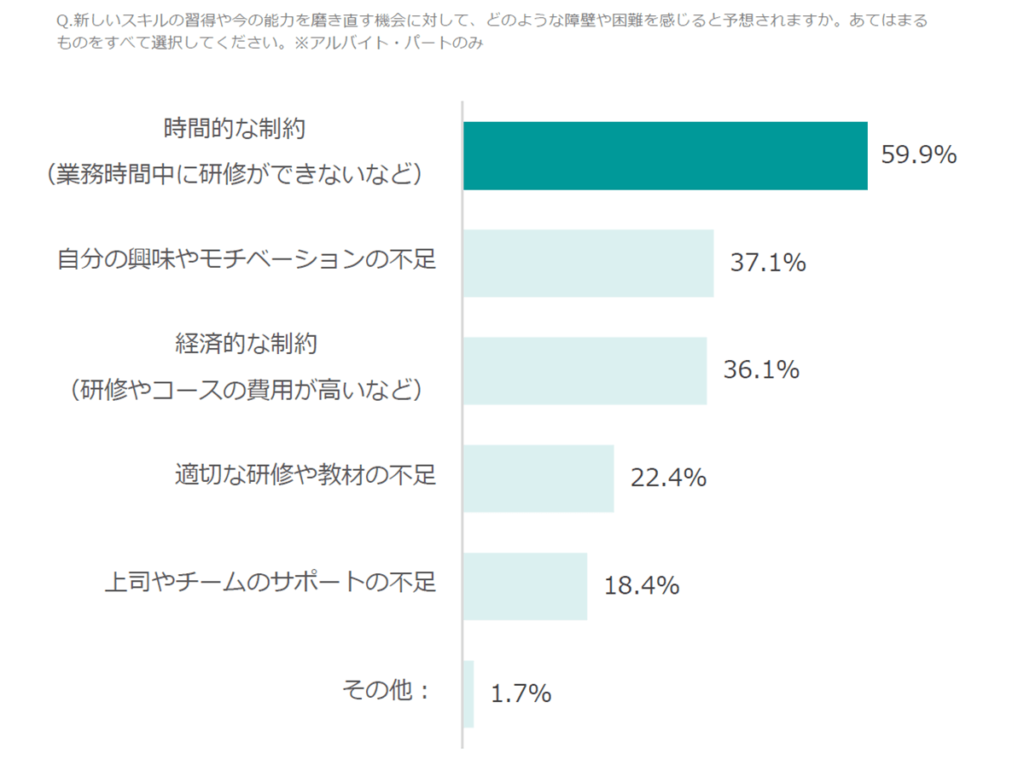 新しいスキルの習得の機会に対して「時間的な制約」に関する不安が大きい。