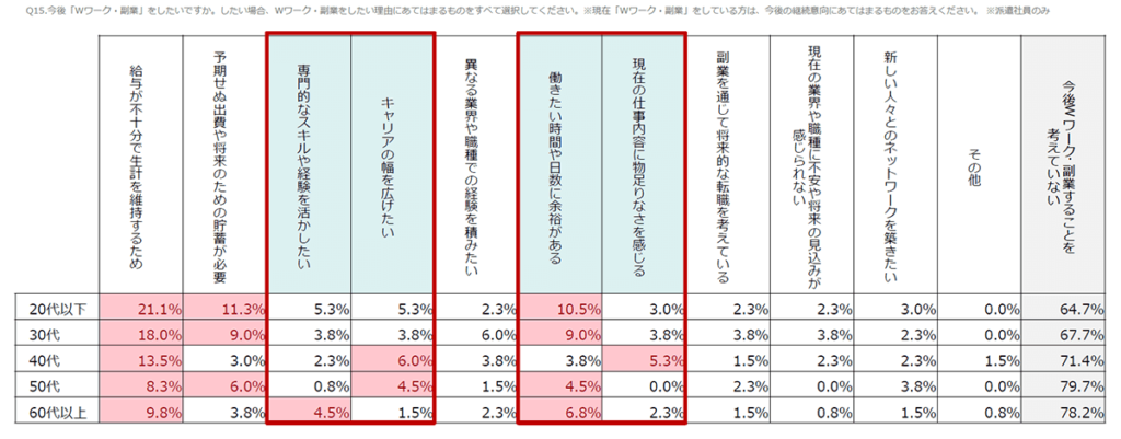 今後Wワーク・副業をしたい理由として、どの年代も金銭面が高いものの、キャリアや経験を活かしたい、働きたい時間の余裕があるためという理由も多い。