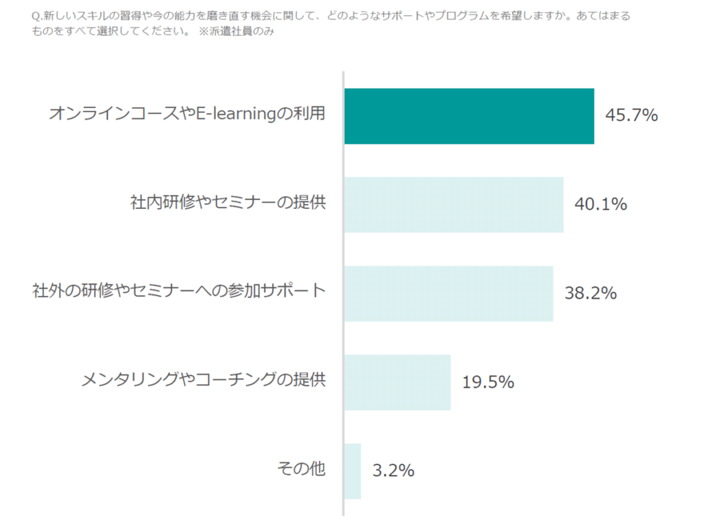 Q.今、働いている職場にて、新しいスキルの習得や今の能力を磨き直す機会があった場合、どのようなスキルを学びたいですか。あてはまるものをすべて選択してください。(希望しない/興味がないを除く)※ 派遣社員のみ
