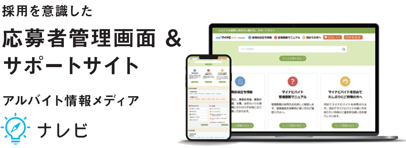 応募者管理画面をはじめ、面接から就業までの疑問に応えるサポートサイトや、アルバイト採用の課題解決の糸口が見つかるアルバイト情報メディアなどを通じてお客様の採用活動に伴走します。