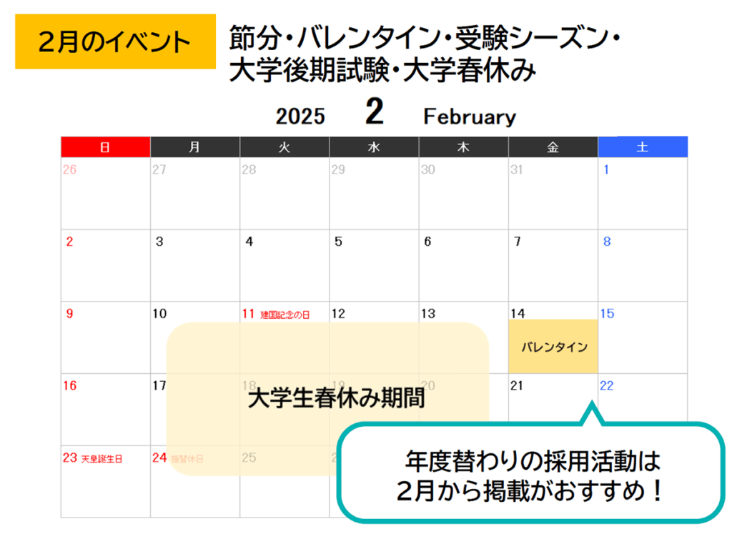 また、新卒入社できなかった大学生がフリーターになるのもこの時期です。2月、3月は質の高い人材を採用できる可能性が高いです。