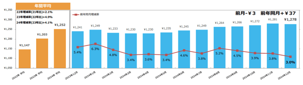 24年12月の全国平均が1,278円で前月比3円、前年同月比は37円の増加しています。