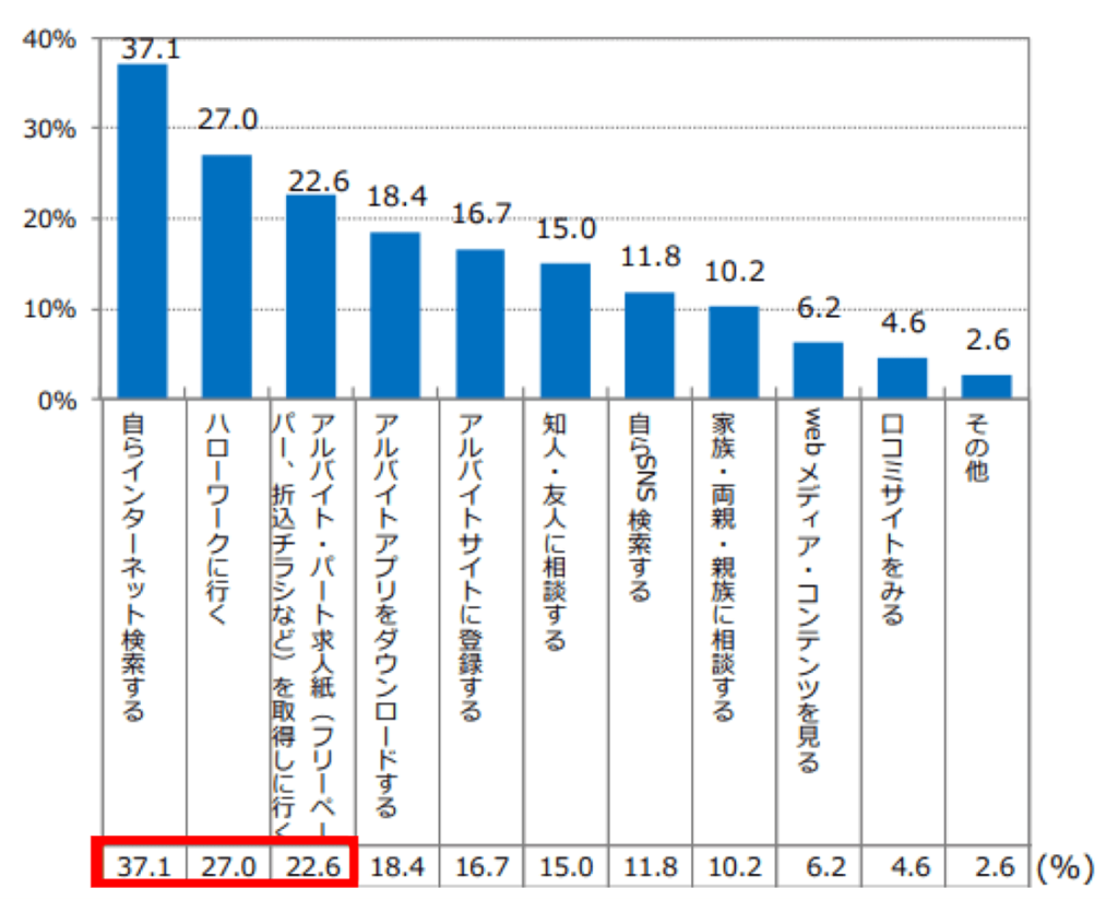 アルバイト探しをする際に始める際に最初にしたこと・今後アルバイト探しをする場合にまずしようと思うことはともに「自らインターネットで検索する」「ハローワークに行く」「アルバイト・パートの求人紙を取得しにいく」が上位に挙がっている。