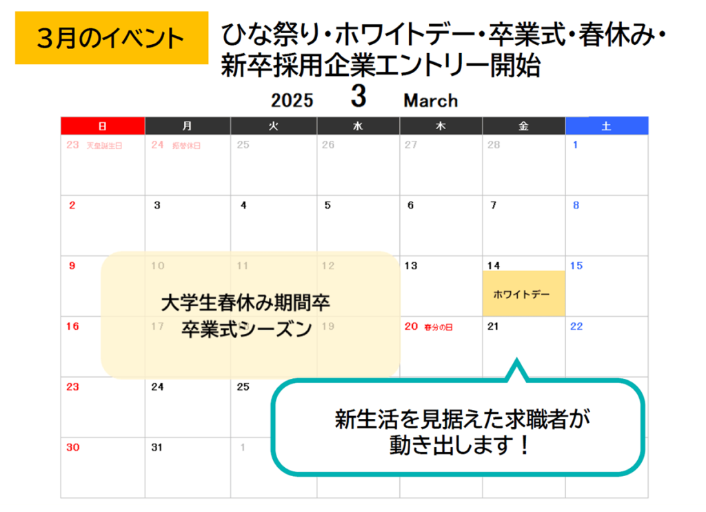 ✓3月は新生活の準備や春の繁忙期に向けた採用活動が重要な時期です。