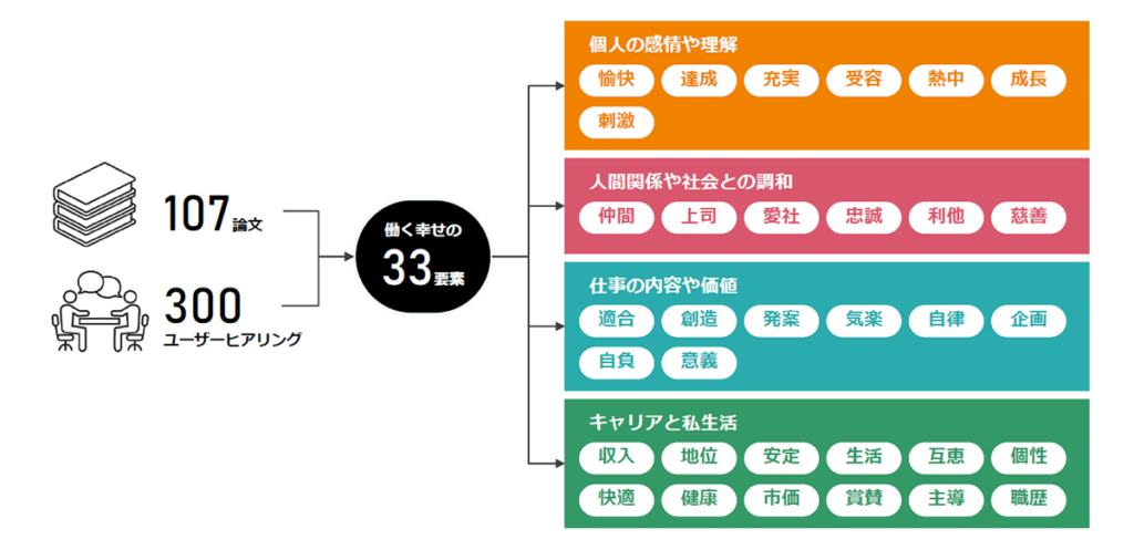 日本の研究や諸外国の研究・知見からの107論文、そしてdipが実施したユーザー300人へのヒアリングを網羅的かつ学術的に分析し、『 働く幸せ』を33の要素に分解しました。