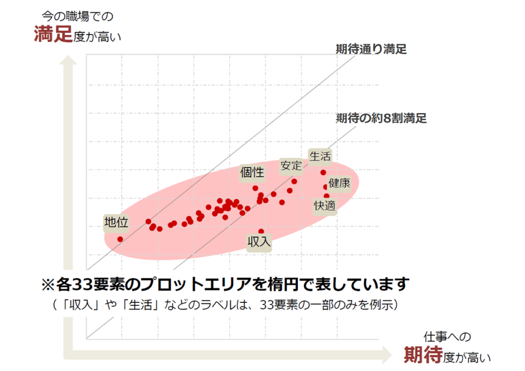 働く幸せの33要素を「仕事への期待度」と「今の職場での満足度」でプロットしたエリアを楕円で表現。各分析結果は、この楕円で示されたプロットエリアと、33要素の平均を表示しています。