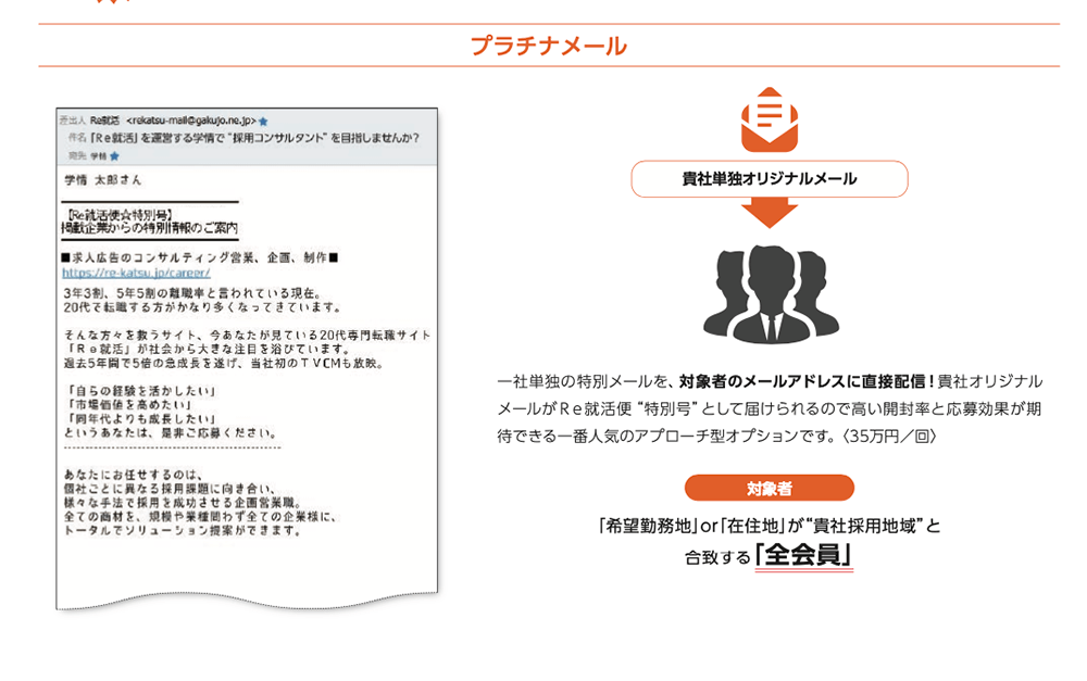 貴社オリジナルメールが「特別号」として届けられるので高い開封率と応募効果が期待できる一番人気のアプローチ型オプションです。