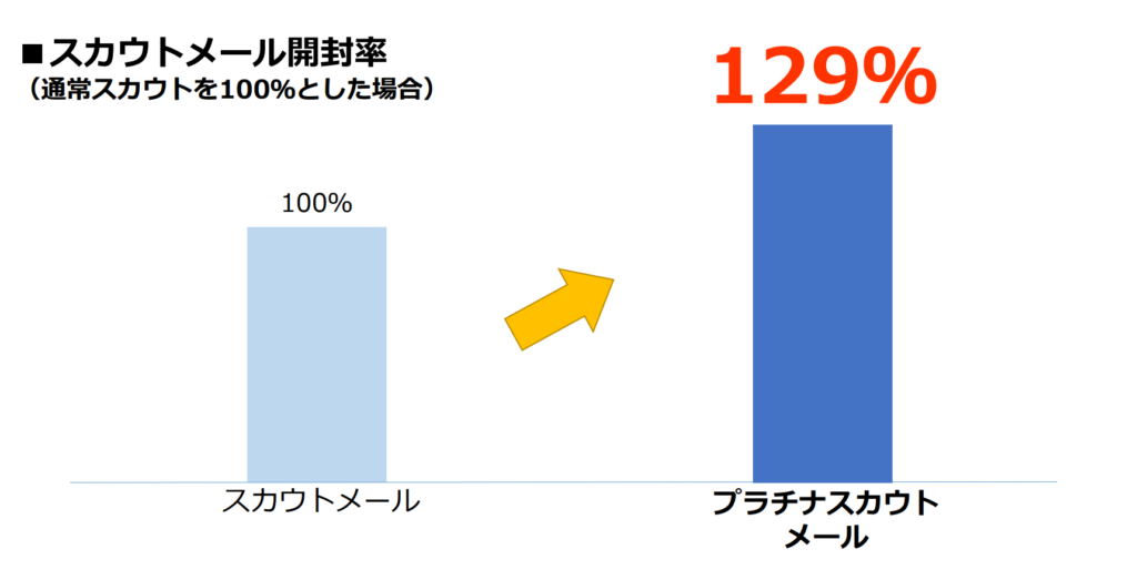 スカウト一覧に通常表示されるスカウトメールと比べて、プラチナスカウトメールの場合は、1.3倍近く高い開封率を誇ります。