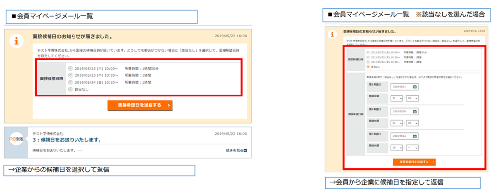 配信した⾯接候補日より、応募者がマイページより日程選択し返信します。