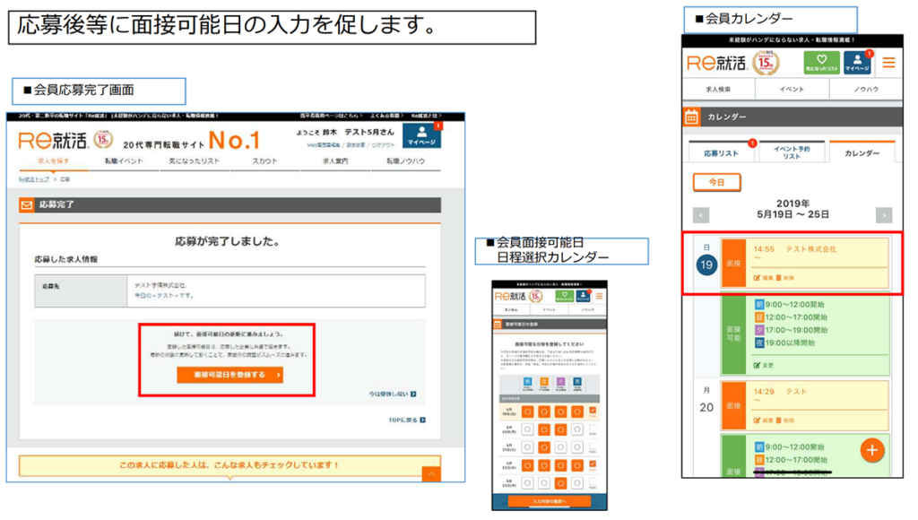 応募時など要所で⾯接可能日の登録を促すため、⾯接可能日を登録するカレンダーを会員側に実装!