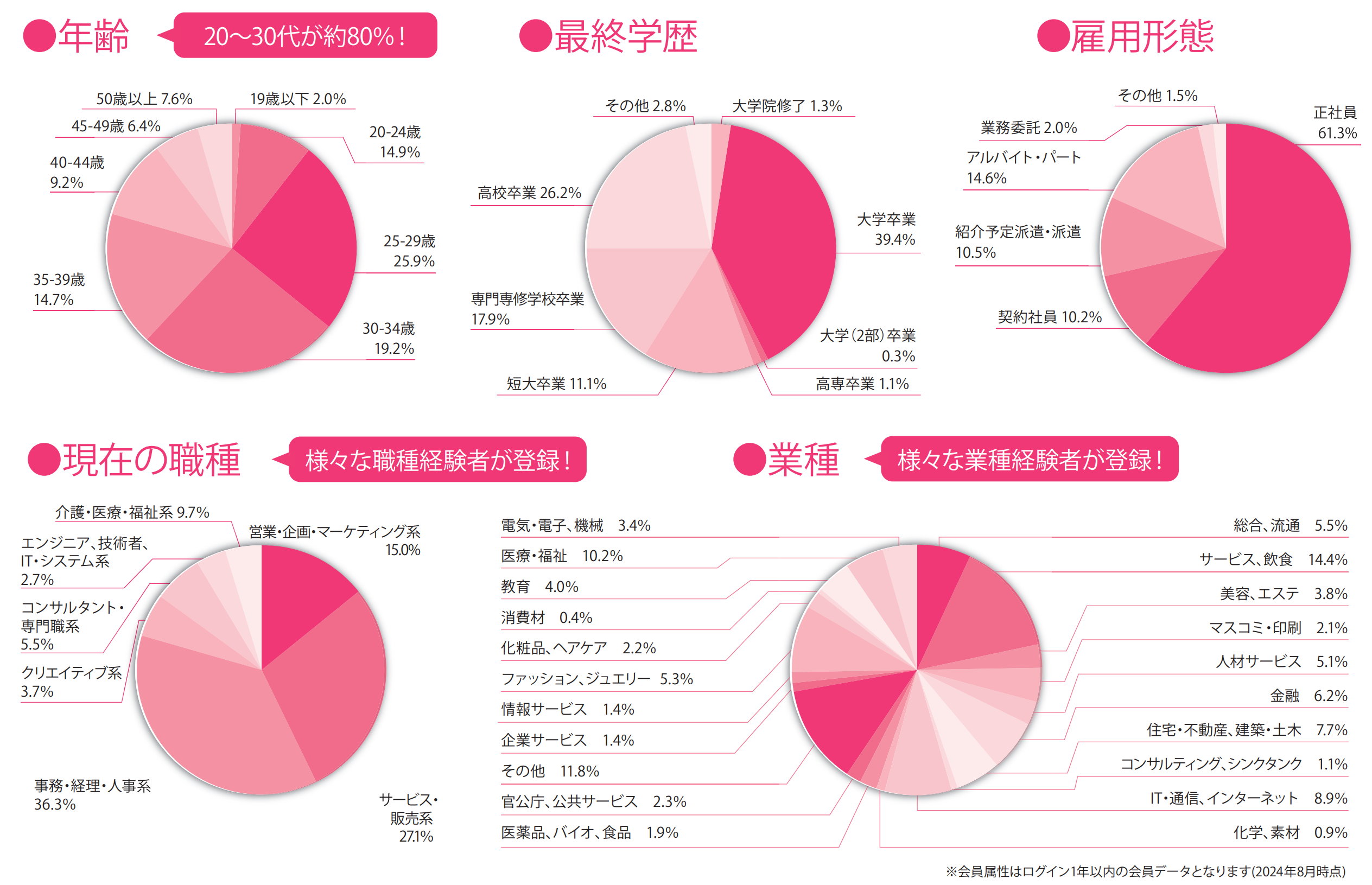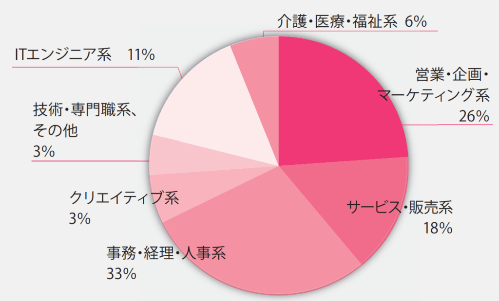 会員数192万人を誇る女の転職type。年齢層は20代後半から30代までがメインの層となっており、最終学歴は大学卒業が4割ほど、雇用形態は正社員が6割を超えます。現在の職種は販売、事務、営業が多くなっています。