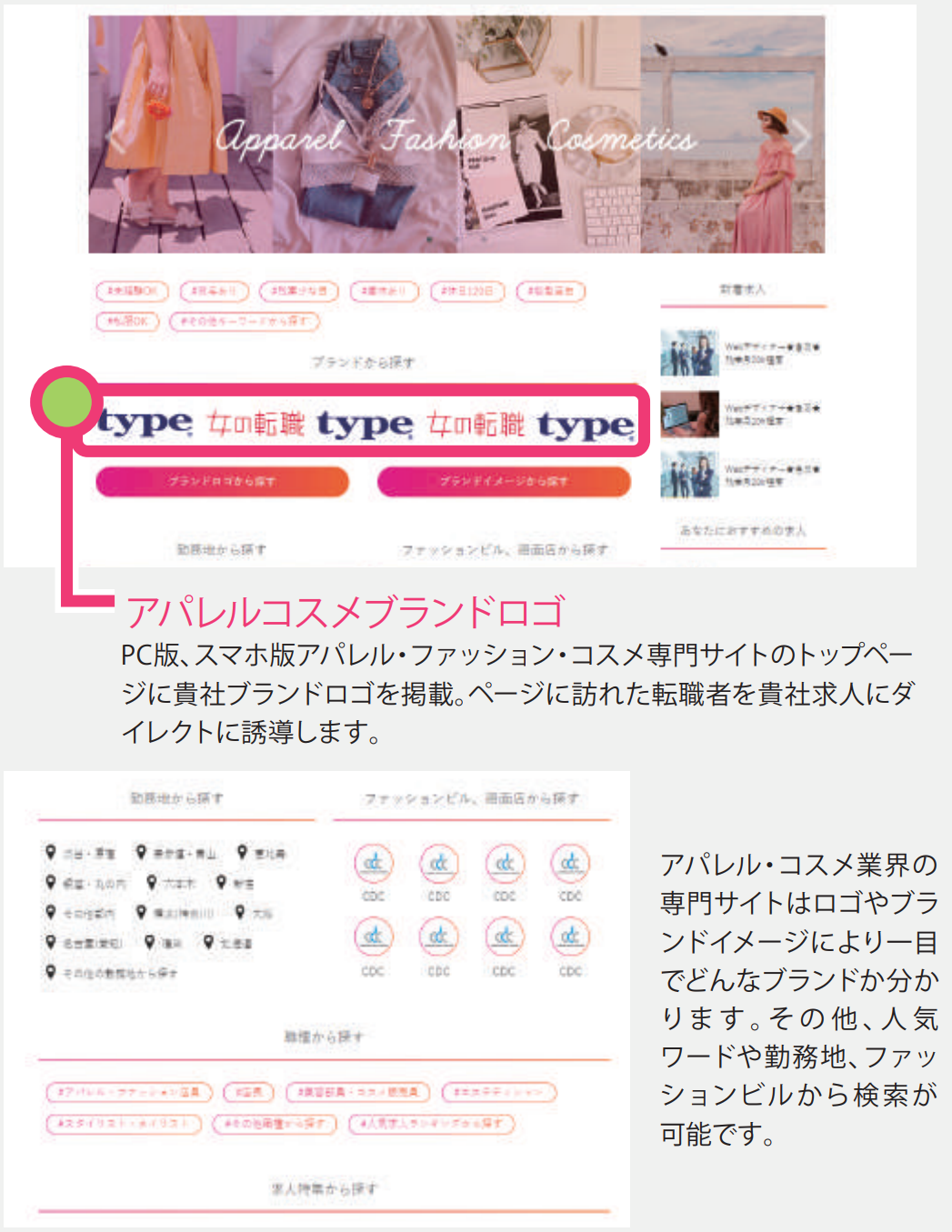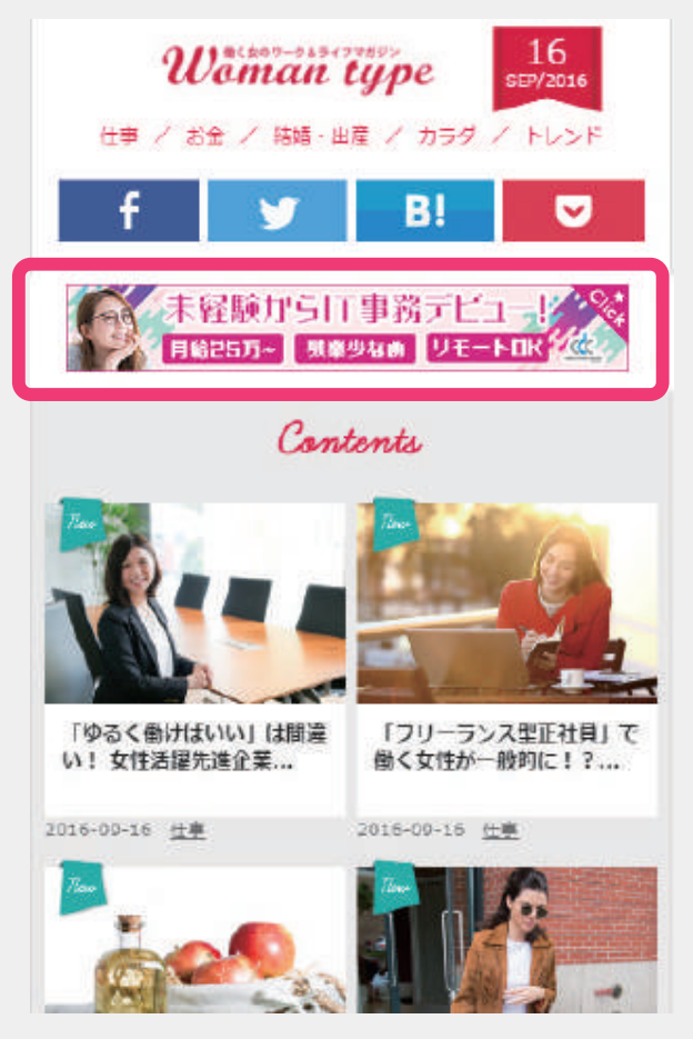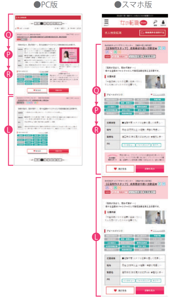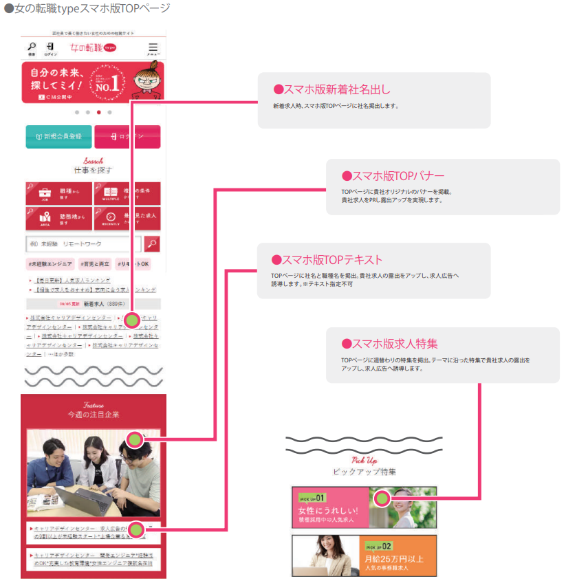 スマホ版「女の転職type」職種検索結果ページに貴社単独のオリジナルバナーを設置し、求人広告へ誘導します。