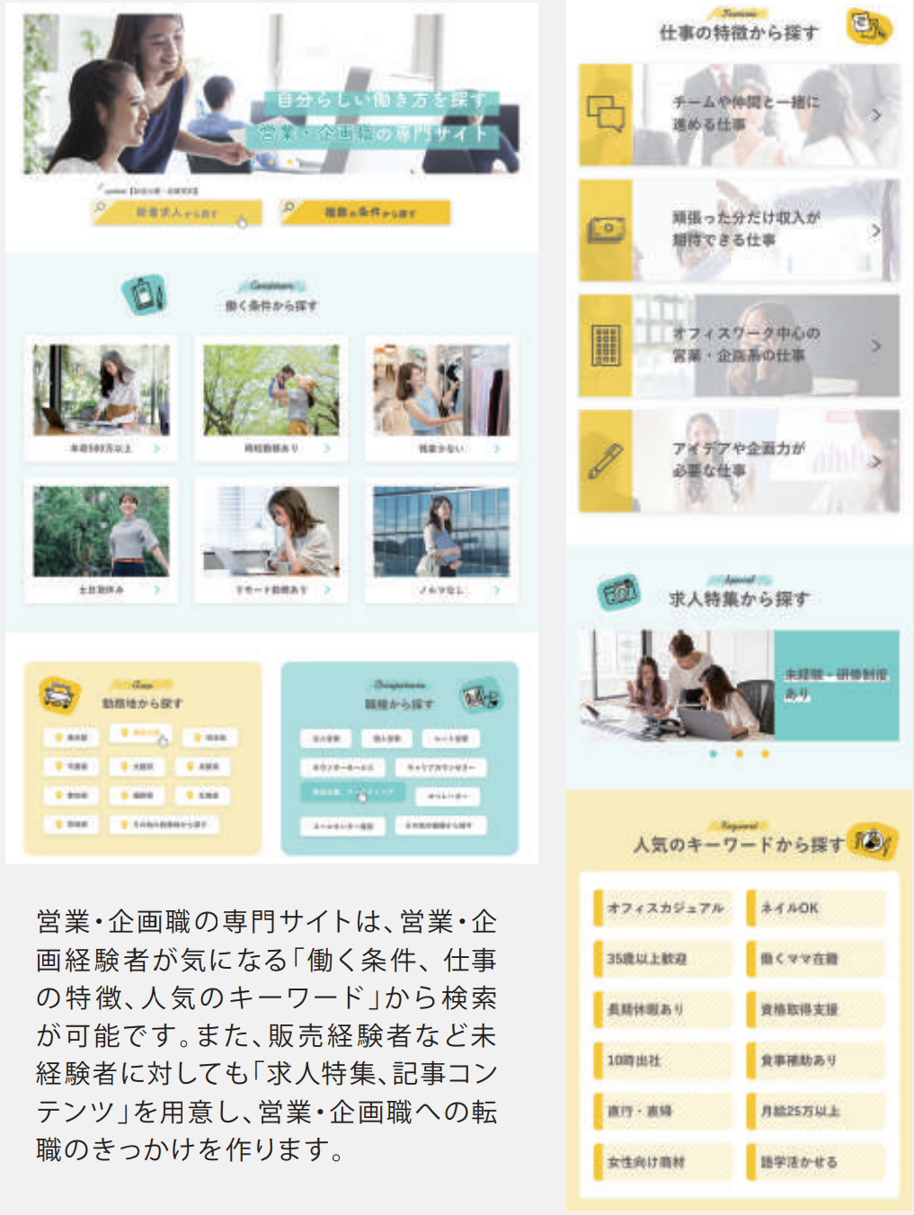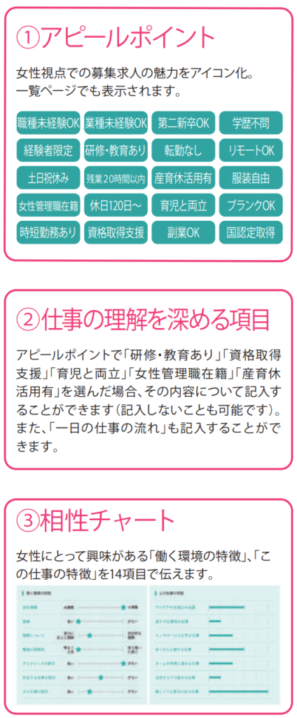 「職種名を聞いてもピンと来ない」「職種にとらわれず自分に合う会社を見つけたい」という女性ユーザーの声を反映したユーザー志向で検索できるオリジナル検索です。