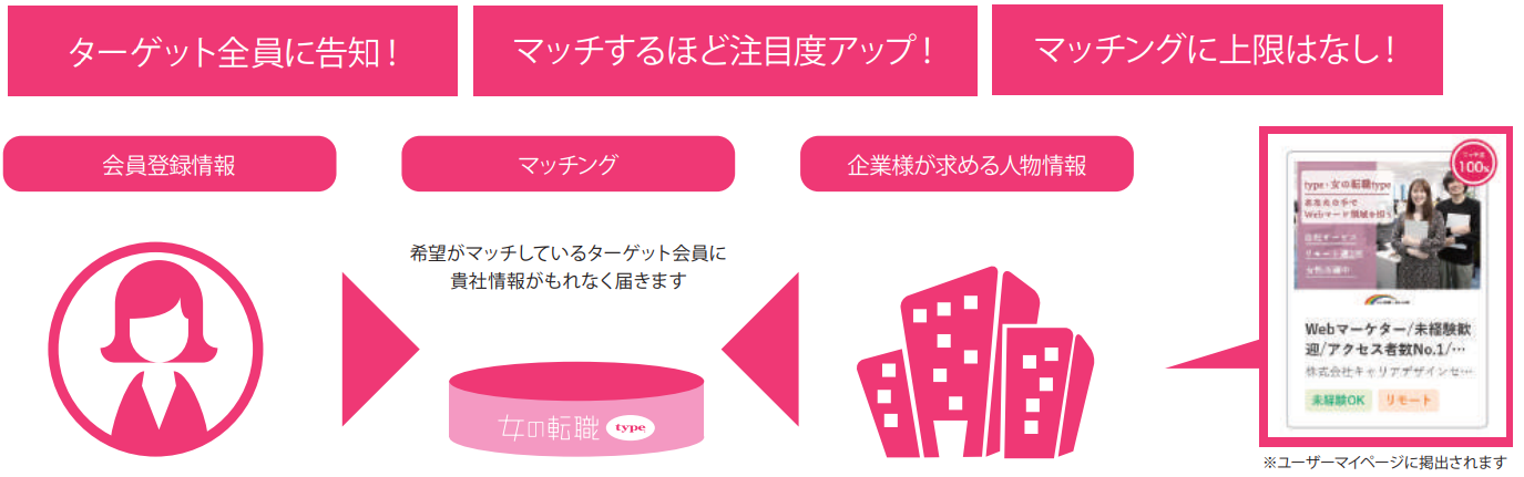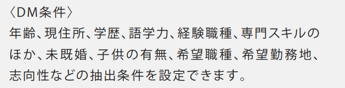 プロフィール、経験スキル、希望職種・業種、働く環境への志向の項目(※下記マッチング設定項目図参照)でマッチングの設定をすることで、会員情報と企業が求める人材情報からよりマッチングするユーザーを絞り込み直接アプローチが可能な機能です。効率よく有効に応募者を獲得することが可能です。