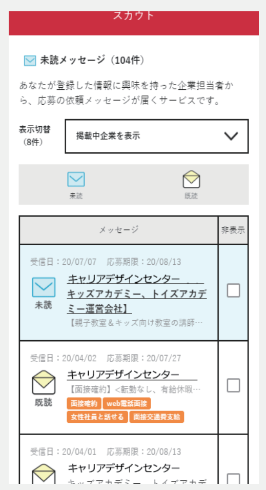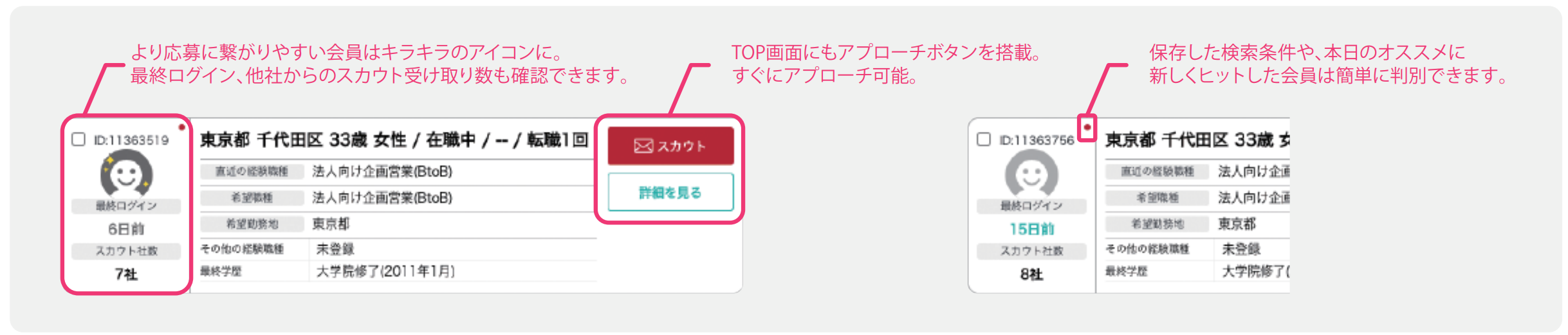 応募に繋がりやすいユーザーが一目で分かるアイコン表示になっており、すぐにアプローチが可能です。