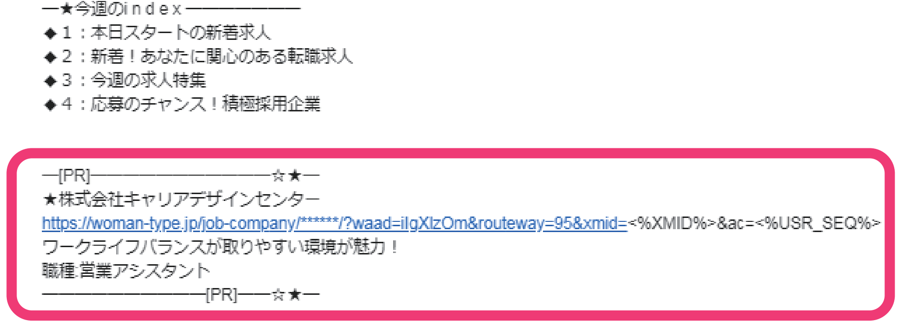 毎週発行される新着求人メールマガジン(※)の冒頭部分で貴社求人をPRし、ダイレクトに募集ページに誘導します。