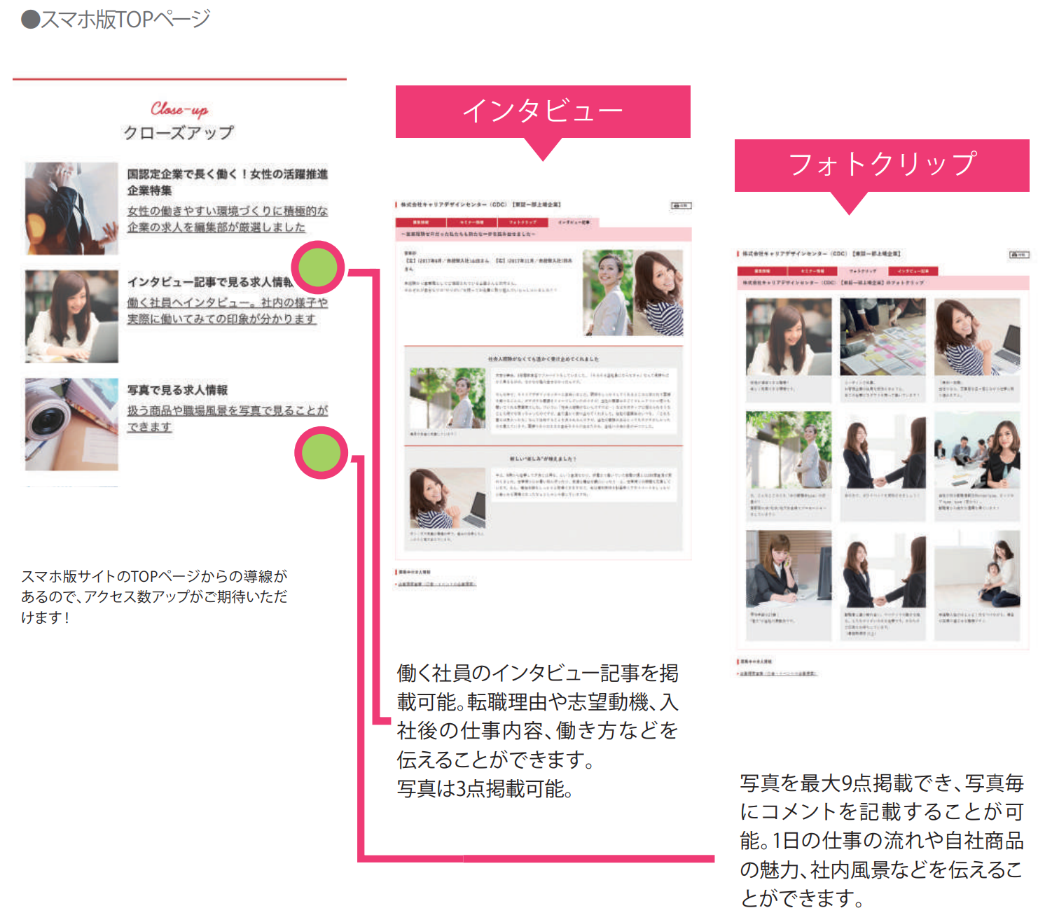 インタビューページ、フォトクリップページからお選びいただけます。より多くの情報を掲載することで、