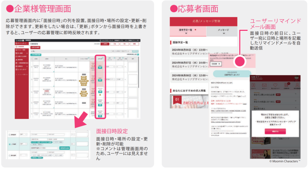 - 面接日時・場所がユーザーマイページに即時反映され、面接日時と場所の間違いを防ぎます!